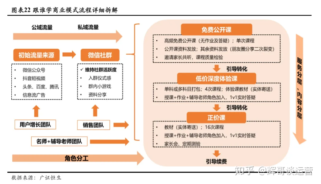这第1张图,商业模式流程拆解,流量从公域转化到私域,在经过私域流量的运营,最终转化为付费用户。对于K12教育类公司、金融类公司,基本都是如此的模式。